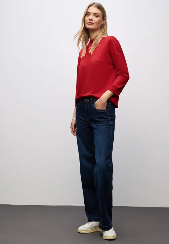 Camisa de mujer de color liso, presenta un cuello barco con un sutil detalle acanalado. Su cómodo tejido de punto ofrece una comodidad excepcional, mientras que las mangas tres cuartos le dan un toque moderno. Una prenda básica y elegante para looks versátiles.