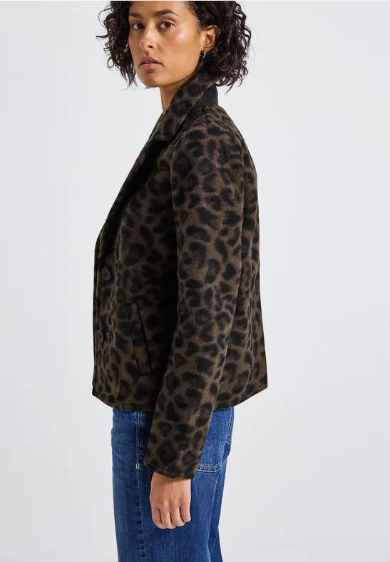 Chaqueta corta con solapa de muesca, estampado de leopardo y bolsillos laterales ofrece una comodidad excepcional y un toque de sofisticación. Ideal para quienes adoran combinar cortes clásicos con estampados modernos.