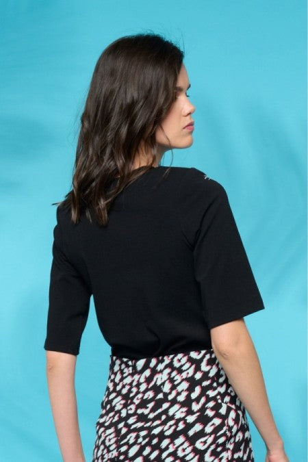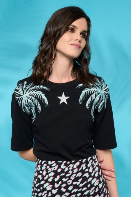 Top de cuello redondo y manga francesa. Bordado frontal de estrella y de palmeras en hombros. Tejido de algodón.