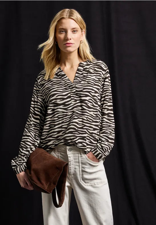 Con su moderno estampado de cebra, esta túnica se convierte en una prenda imprescindible para la mujer moderna. Su suave tejido de viscosa y su corte fluido garantizan una gran comodidad. El escote en V aporta un toque de ligereza femenina al conjunto.